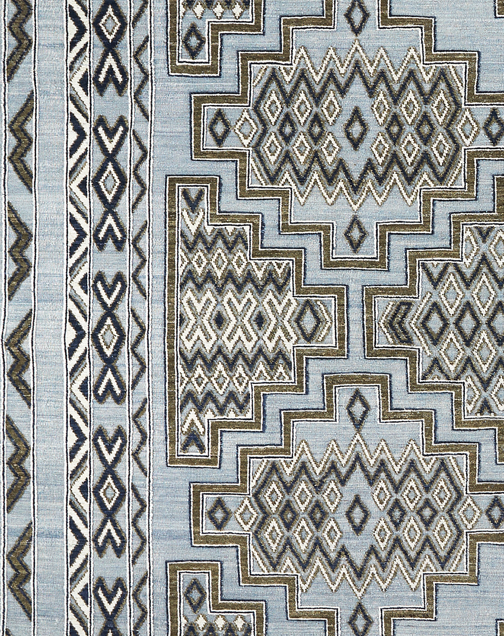 The collection draws inspiration from the designs of utilitarian mats carried around by one of the most resilient nomadic tribes of the Sahara desert: the Tuaregs. Traditionally, these mats are crafted using dried palm reeds and leather. Hand-knotted in the highlands of Afghanistan with hand-carded and hand-spun wool, the Sahara collection provides a contemporary interpretation of the Tuareg mats by exploring the traditional symbology of star and cross patterns with a palette of earthy tones and indigo that reflects its design narrative. The range took over three years to develop, prioritising sensitivity in its cultural designs and use of significant colours.