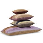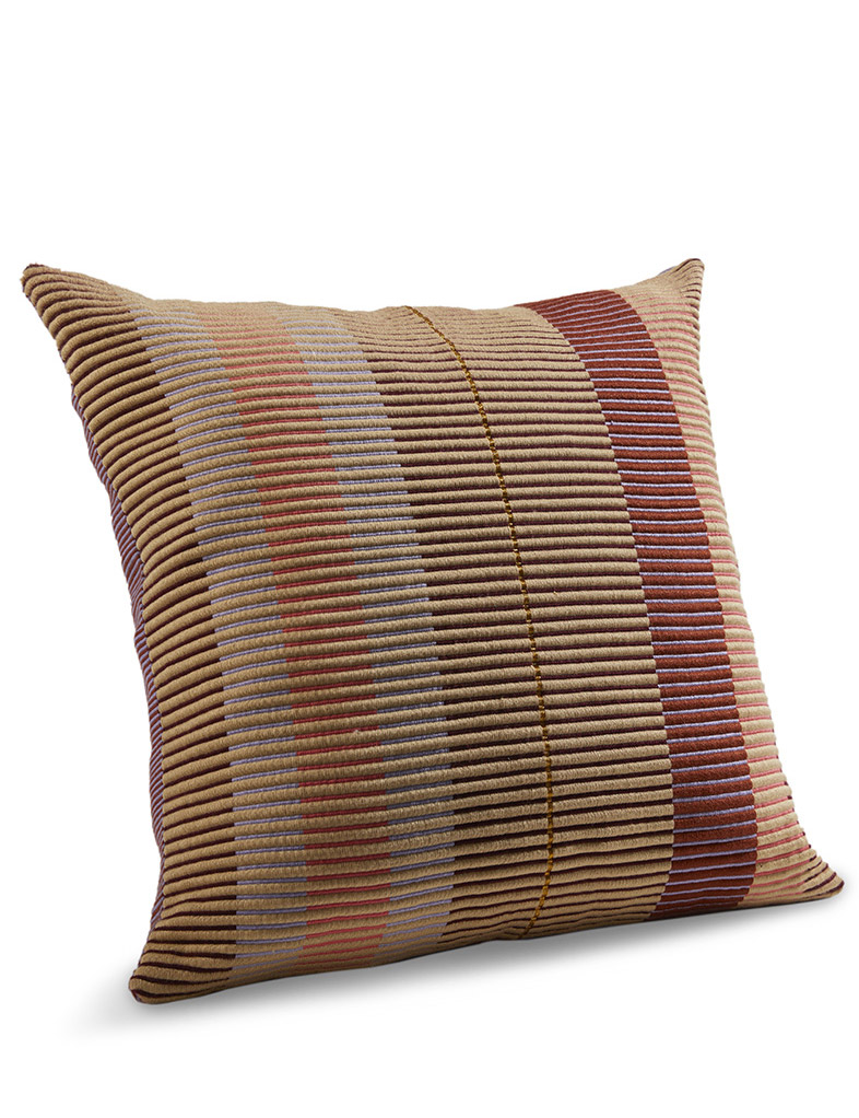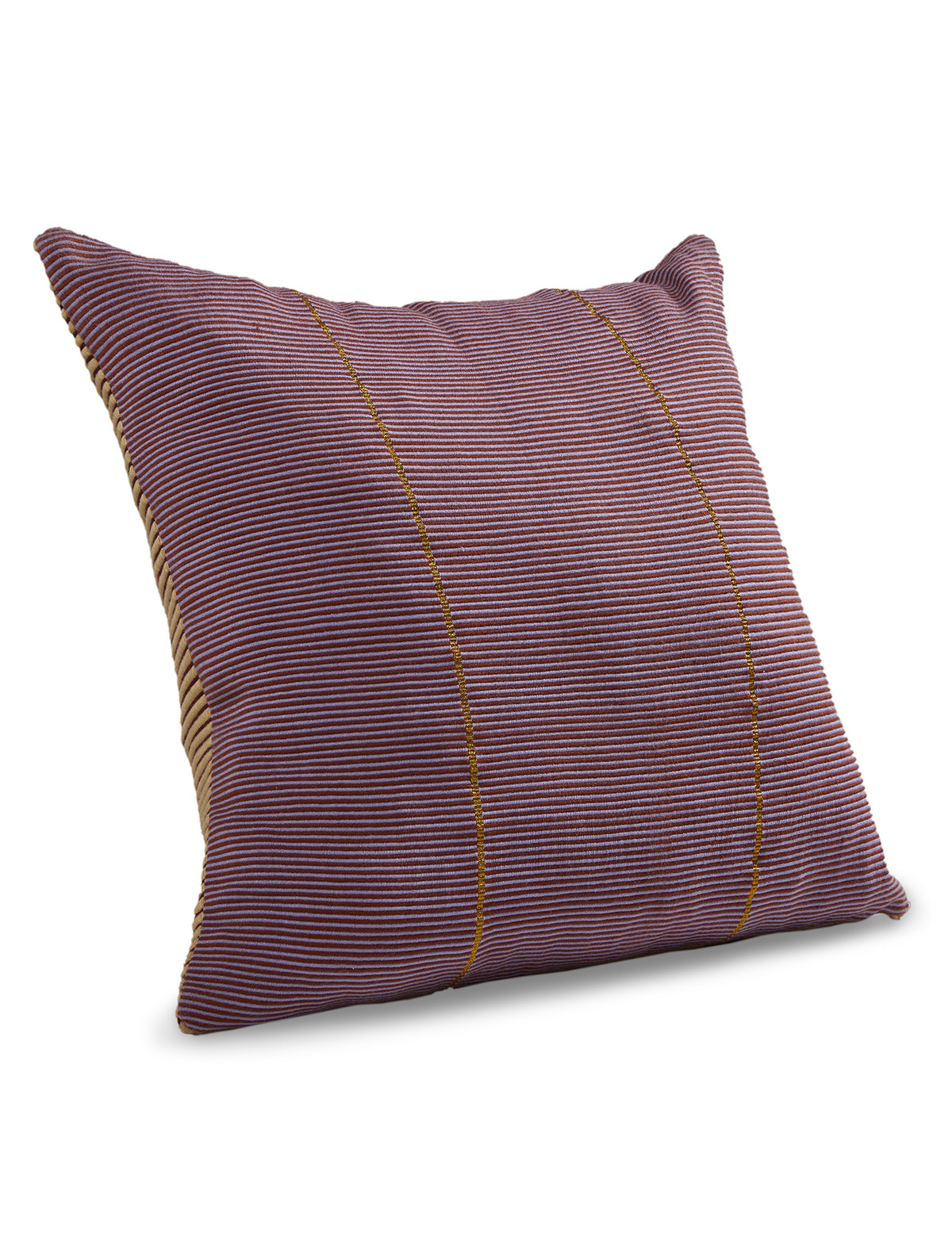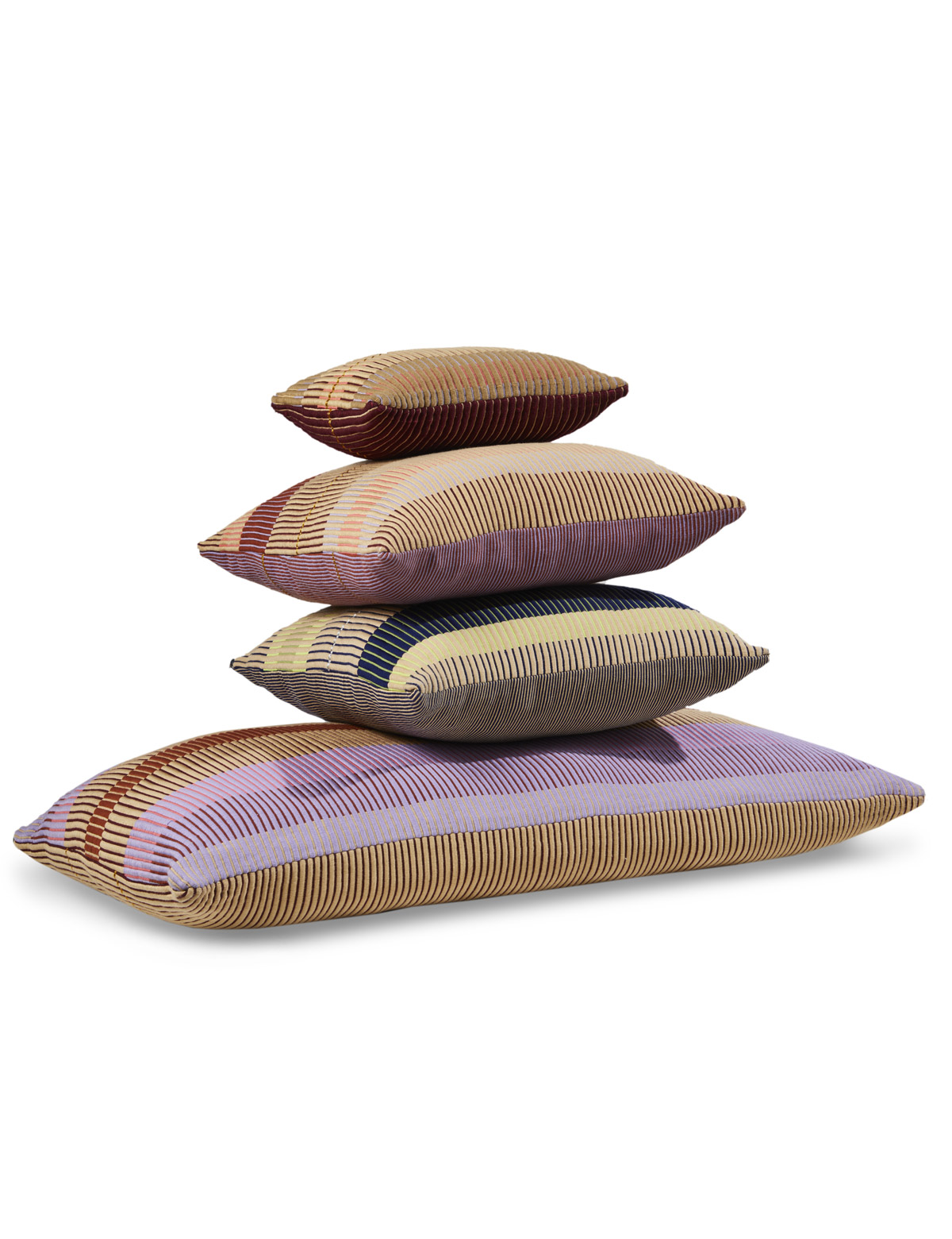 Designed by Mae Engelgeer, the Chumbes cushion collection takes inspiration from the Chumbe Inga, a traditional Colombian garment with characteristic symbols. Comprising of scattered cushions and floor cushions, the Chumbes collection is handmade using natural cotton and fine metallic yarns. The ribbed structures create a unique graphic composition that follows a deeply rooted weaving technique specific of the Sibundoy region.