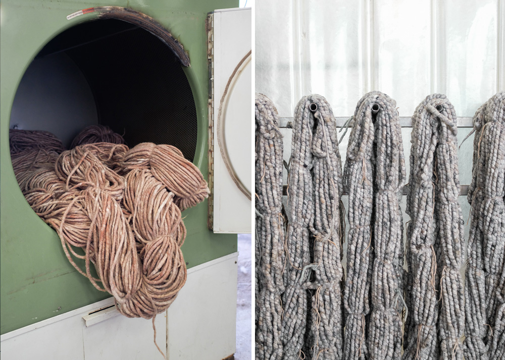 The next step is the felting of the yarn. Using specialised equipment similar to a commercial washing machine, the yarn is exposed to heat, friction and water to shrink the wool fibers and make them fuse together. This process strengthens the surface of the yarn, creating a seal that has a natural resistance to stains and ensuring the rug will not pill or shed over time.