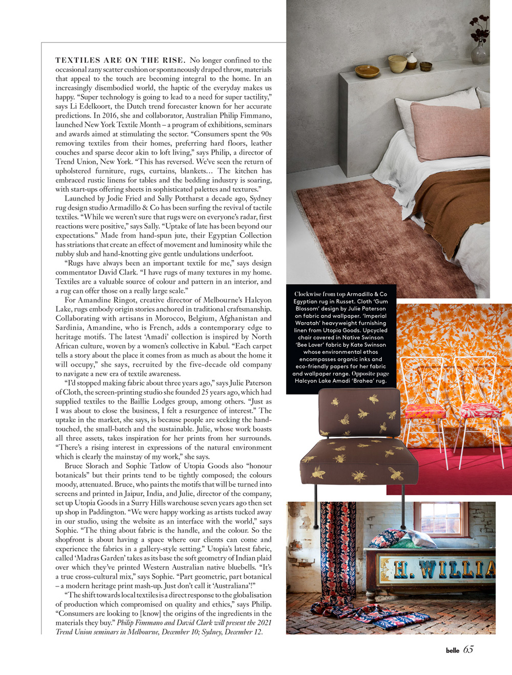 Halcyon Lake’s creative director Amandine Ringot was recently featured in Belle Magazine’s October 2019 issue. In conversation with editor Stephen Todd, Amandine and a fantastic panel of fellow textile designers shared their thoughts on the revival of textiles in the home and the rising trend for beautiful, refined materials that are also ethically produced.