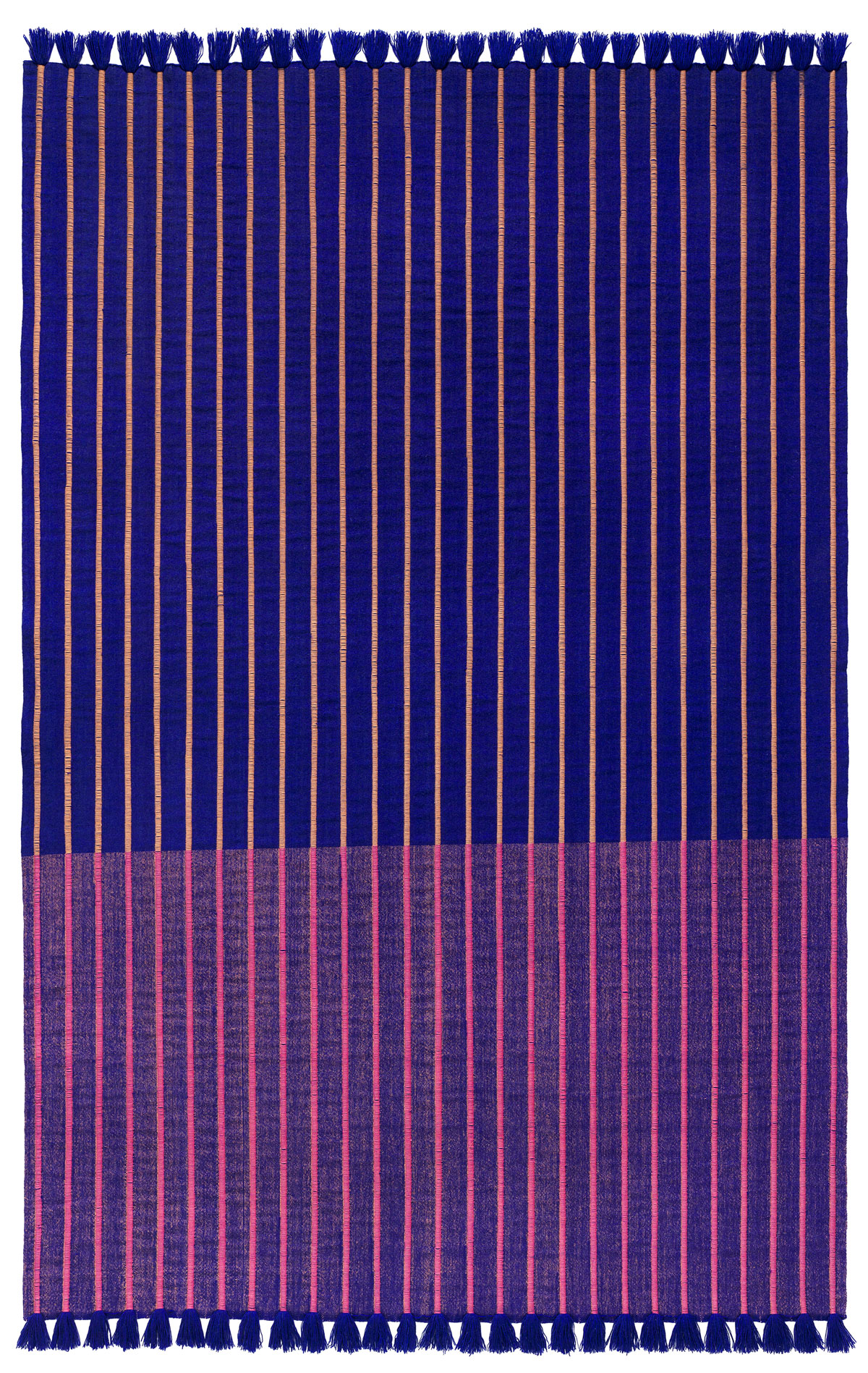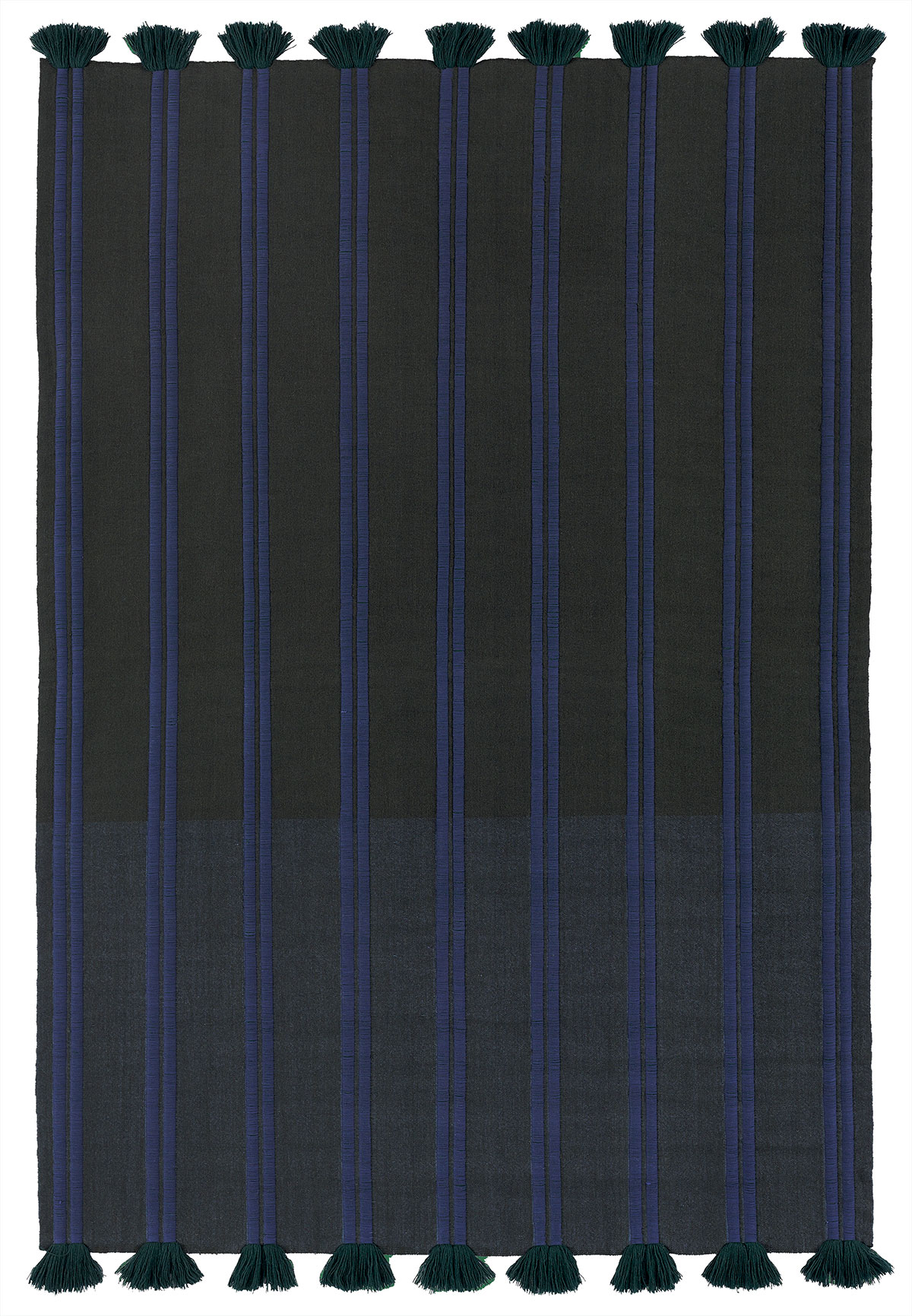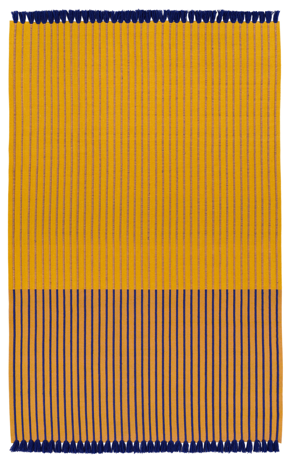 B – Homeland, from our Stripes collection. Each rug is one of a kind because we use left-over yarn and the weavers are allowed to choose the design themselves. Three weavers work side by side and the placement of colour and thickness of each stripe is decided by each individual weaver. Even though each panel of the rug is made using the same material and colours, each section is unique and reflects the craftsmanship that goes into each rug.