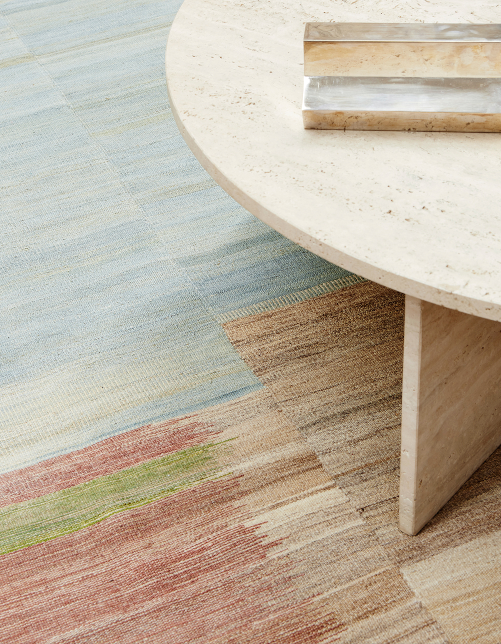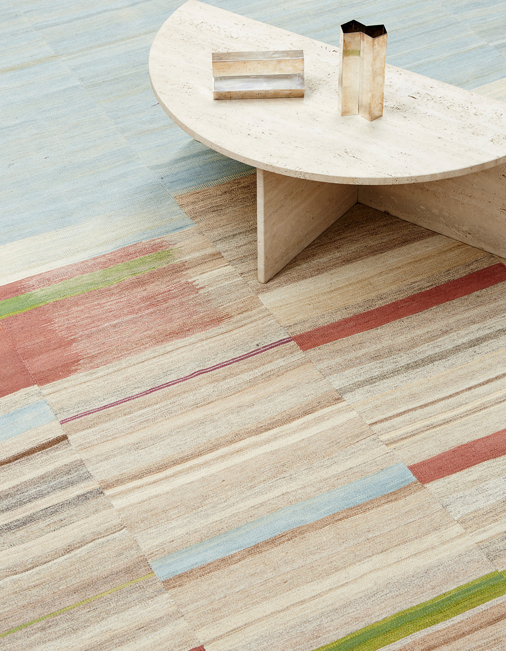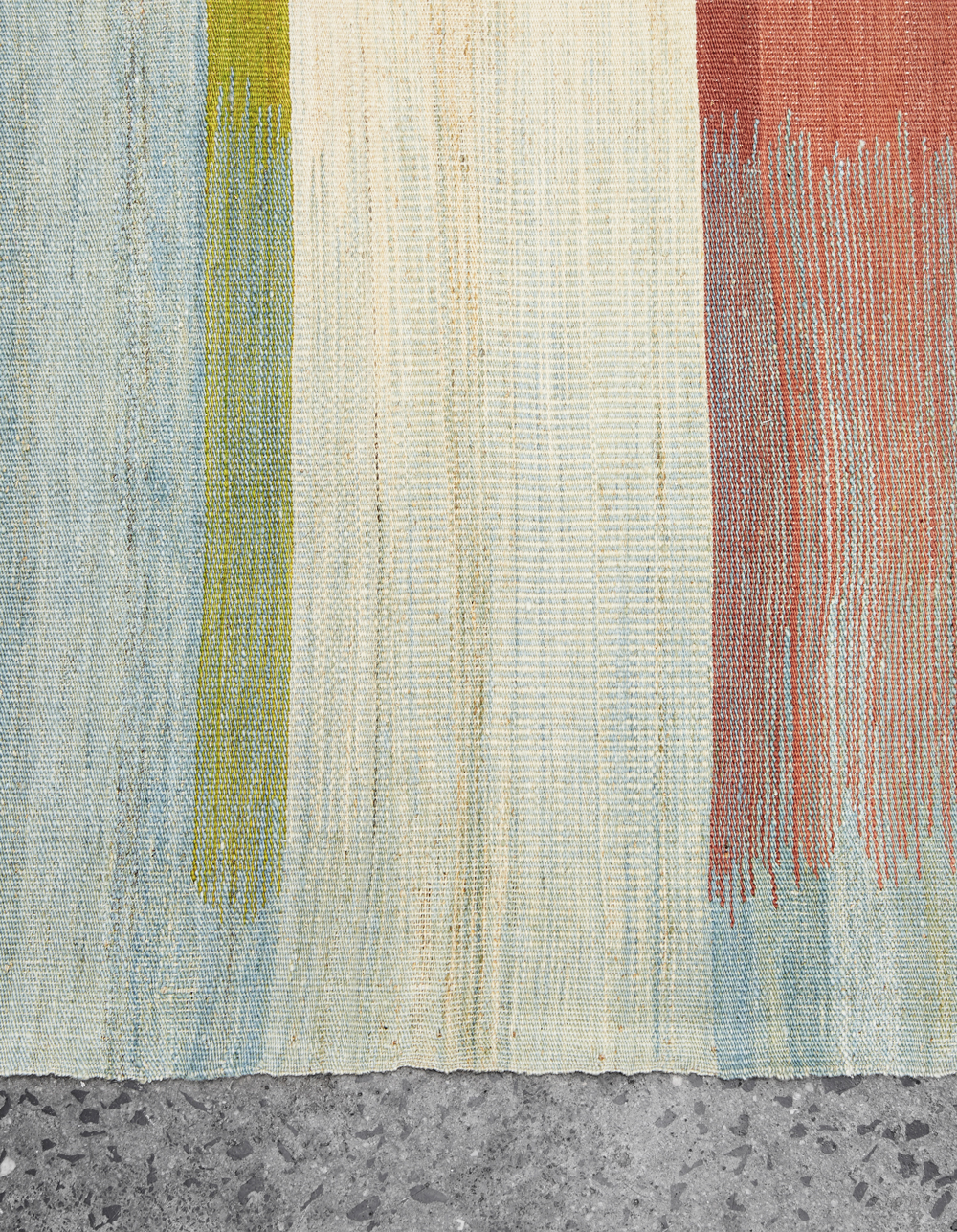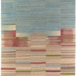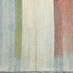 The highly detailed designs are reminiscent of abstract modernist paintings, constructed as a series of vertical panels. Individually woven by hand on narrow wooden looms, the panels are meticulously sewn together to create infinitely varied patterns. These dense flat-weave kilims are of the highest quality, ensuring their durability and longevity. Edelgrund’s signature hand-embroidered borders give the Alasht collection a refined elegance.