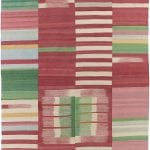 The highly detailed designs are reminiscent of abstract modernist paintings, constructed as a series of vertical panels. Individually woven by hand on narrow wooden looms, the panels are meticulously sewn together to create infinitely varied patterns. These dense flat-weave kilims are of the highest quality, ensuring their durability and longevity. Edelgrund’s signature hand-embroidered borders give the Alasht collection a refined elegance.