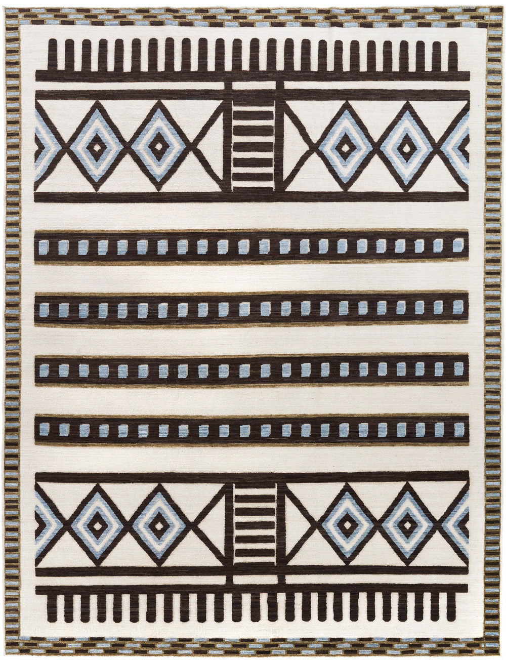 Crafted to improve with age and develop a patina in the tradition of antique carpets. The unique designs in this collection stem from an exploration of African culture and the shapes and colours found in its traditional textiles. Designed by Jawed Ahmadi, the compositions are mostly inspired by Kuba cloth, commonly produced in the Democratic Republic of Congo and typically characterised by vast and varied abstract geometric designs.