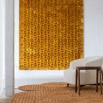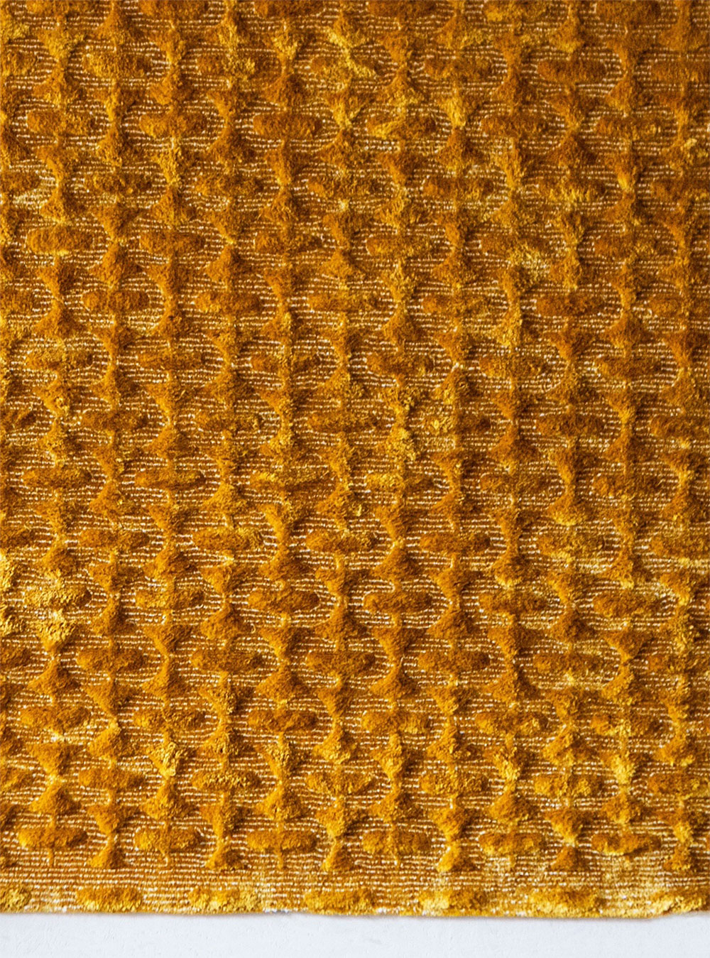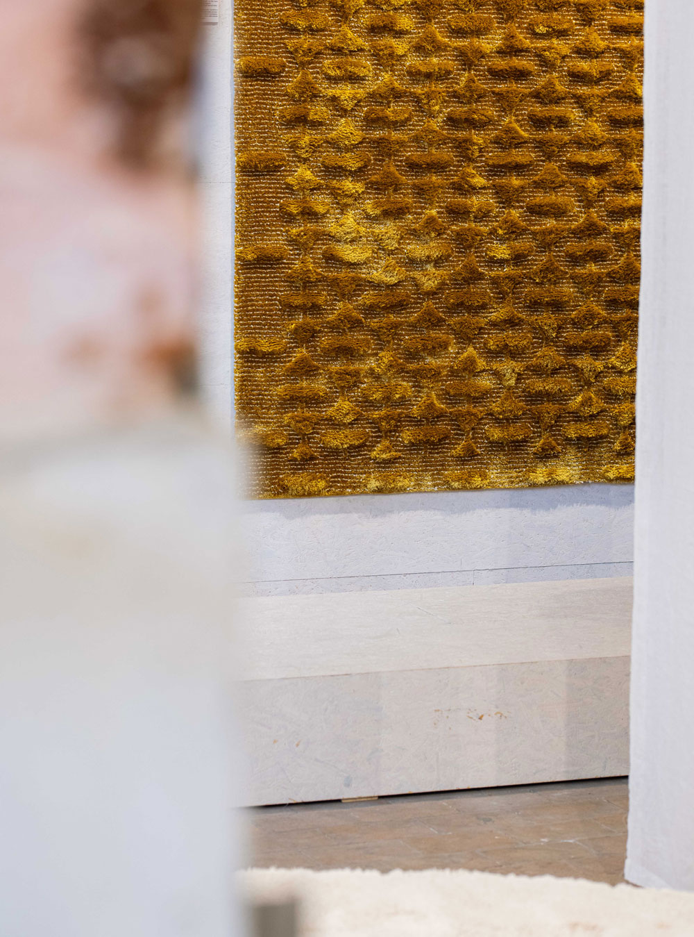Designed by Belgian textile design studio Evolution 21, Lena is a textural rendition of an abstract geometric design initially created as an upholstery fabric. The unique pattern is formed by alternating piles heights and varying tufting techniques, which not only create texture but also an interesting 3-dimensional effect. Lena is hand-crafted with sustainable lyocell, a soft and shiny fibre made from the Eucalyptus tree with similar qualities as natural silk.