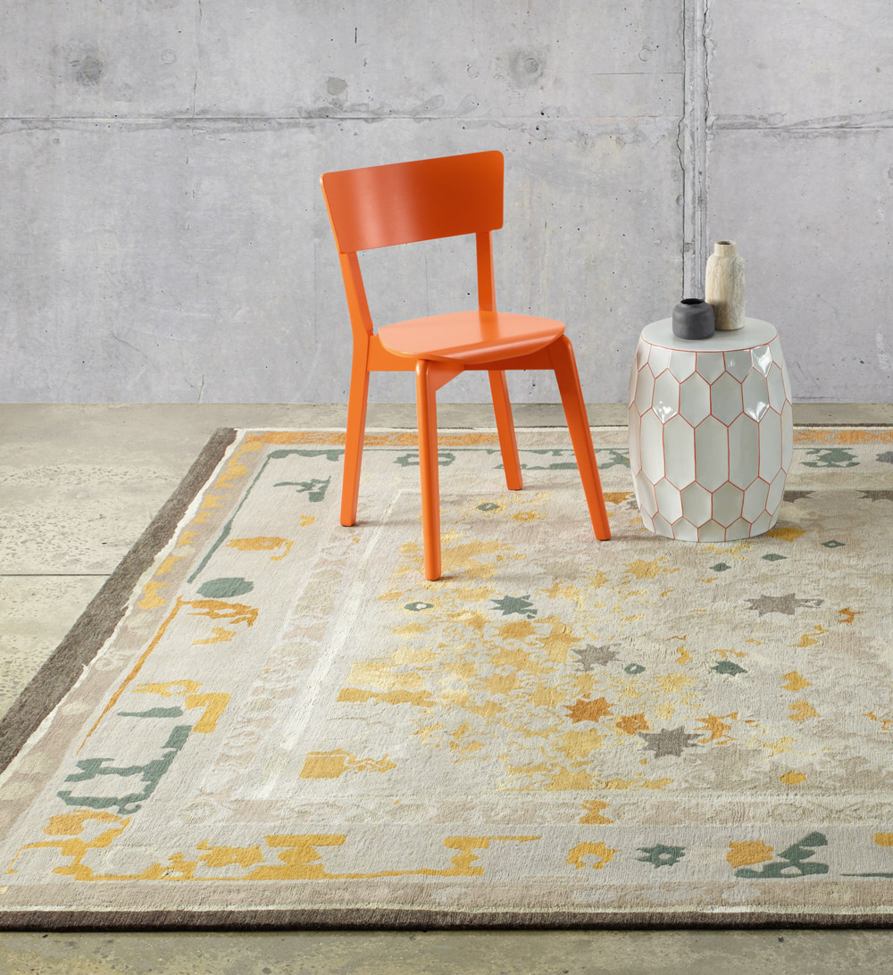 Karaoke Gold is part of Reuber Henning’s ‘Lost in Translation’ collection, inspired by the movie of the same name. The colourful lights of Tokyo, among which Scarlett Johansson and Bill Murray lose themselves in the film, form the backdrop for this collection. Designs in the collection such “Karaoke Gold” , “Whisper” and “Lights” are based on crucial scenes in the film and are a nod to old 19th century rugs from Anatolia. The reinterpretation of traditional elements in a modern style results in rugs with a classical background and surprising patterns and colour combinations. Reaching well beyond their origins, they have an expression and appearance of their own. All designs focus on the star, symbol of justice, protection and guidance.