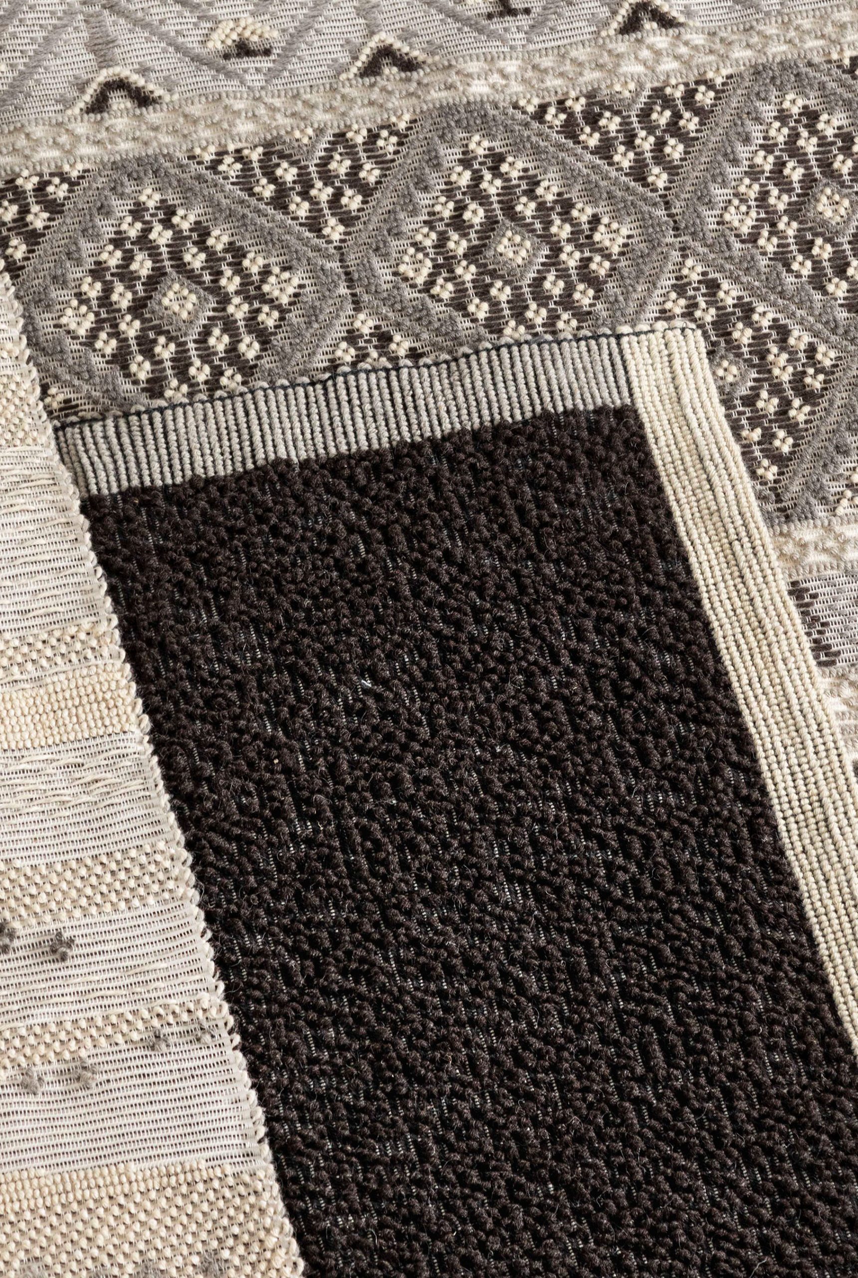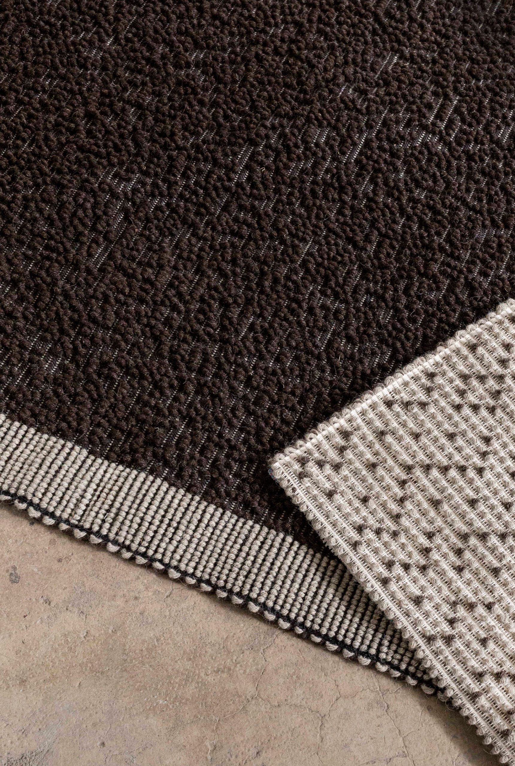 Designed as part of the Tinto in Pecora collection by Studio Salaris & Sans Nom for Mariantonia Urru, Oru draws inspiration from the Sardinian word for “border”. The seemingly simple design puts a fresh spin on the classic monochromatic rug by incorporating a minimalistic border that frames the field. Upon closer look, the variety of textures throughout the rug becomes apparent, intricately woven using a variety of weaving techniques typical of the island.