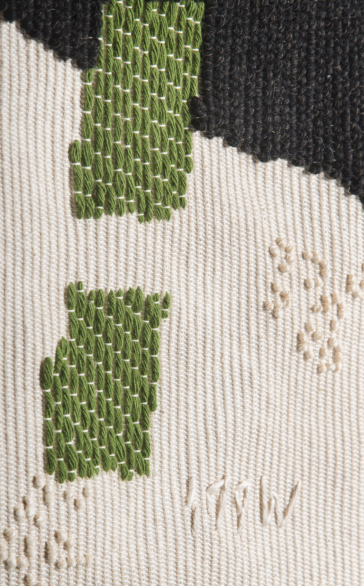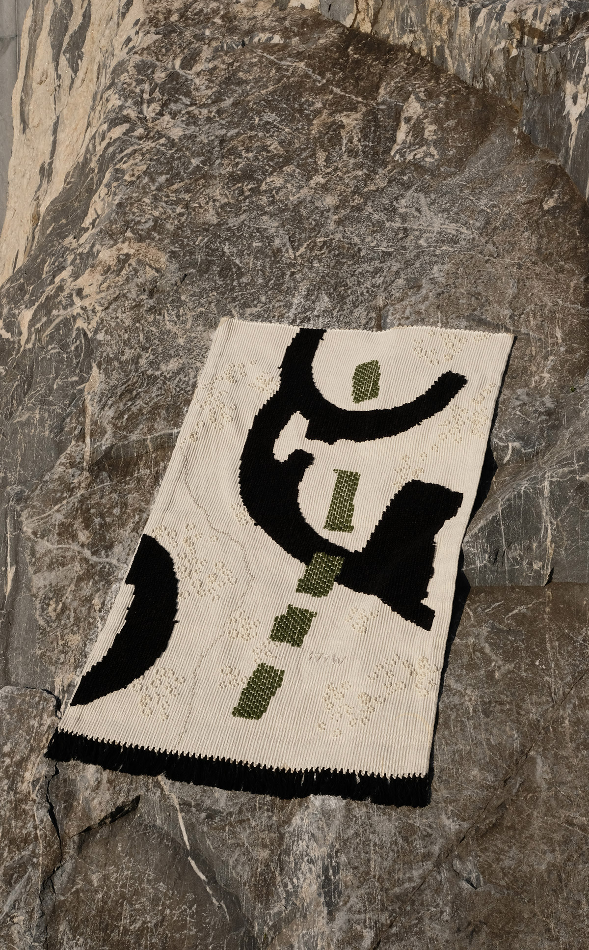 Designed by Roberto Sironi in collaboration with Pretziada and Mariantonia Urru, the Nuragic tapestry draws inspiration from aerial views of migration and architecture of native Sardinian tribes. The name ‘Nuragic’ comes from the ‘Nuraghe’, ancient megalithic stone structures found all over the island of Sardinia and built between 1900 and 730 B.C. The tapestry overlap bird’s-eye views of these structures in various scales, as well as proposing an interpretation of trade routes through the mountainous terrains. The different weaving techniques and materials used complements the juxtaposition of the various worlds. Hand-woven by artisan weaving workshop Mariantonia Urru, the Nuragic tapestry features hand-embroidered phrases from the mysterious Nuragic language and is finished with a hand-knotted fringe.