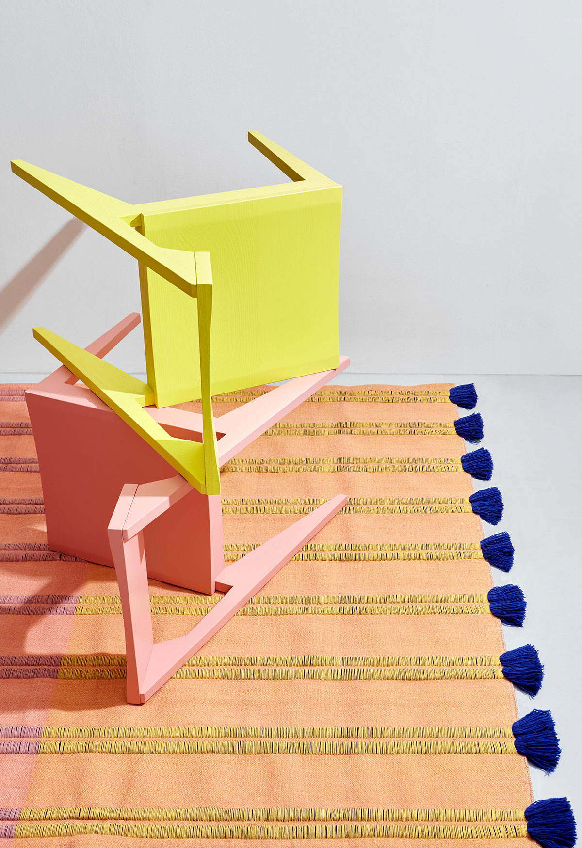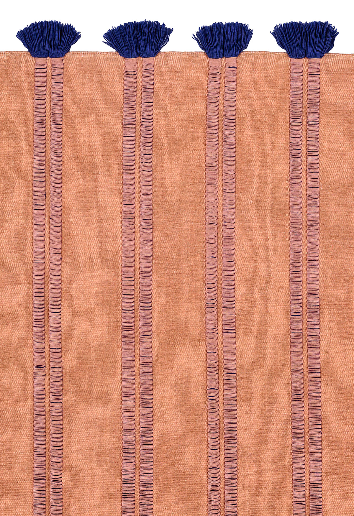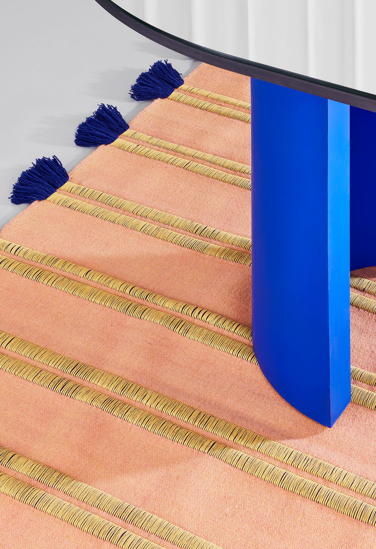 Through experimentation and research into materials and craftsmanship, an innovative combination of two weaving techniques was used; a rib weave and a double weave. The ribbed weave forms the protruding ribs, which, through the use of a large number of weft threads are then knotted to form the fringe detail. The flat stripes between are handwoven in a fine double weave, allowing for the texture and colour contrast to be possible. Handmade in India using high-quality wool yarn, the RIB collection is available in two sizes with three rib variants; fine, medium and double.