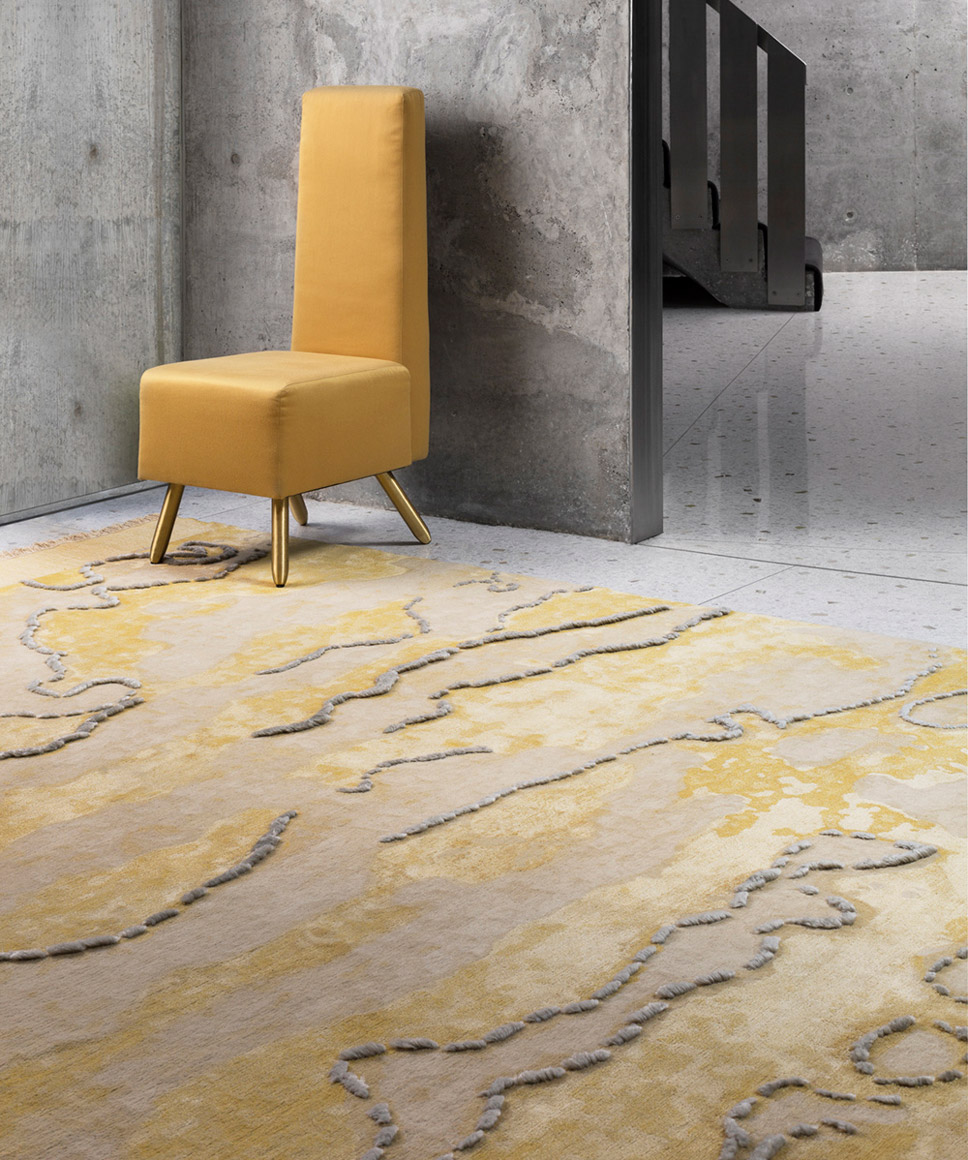 Shibori Wave is part of Reuber Henning’s ‘Shibori’ Collection. “Shibori” merges two types of craft in order to create a superior modern design, drawing inspiration from Japanese batik paintings. With the help of pure wool, silk and different knotting techniques, the fascinating motif with its typical dye and embroidery patterns is transformed into a new design in its own right, a rug with a relief-like structure. Differences in texture are reflected in colour gradations and different pile heights.