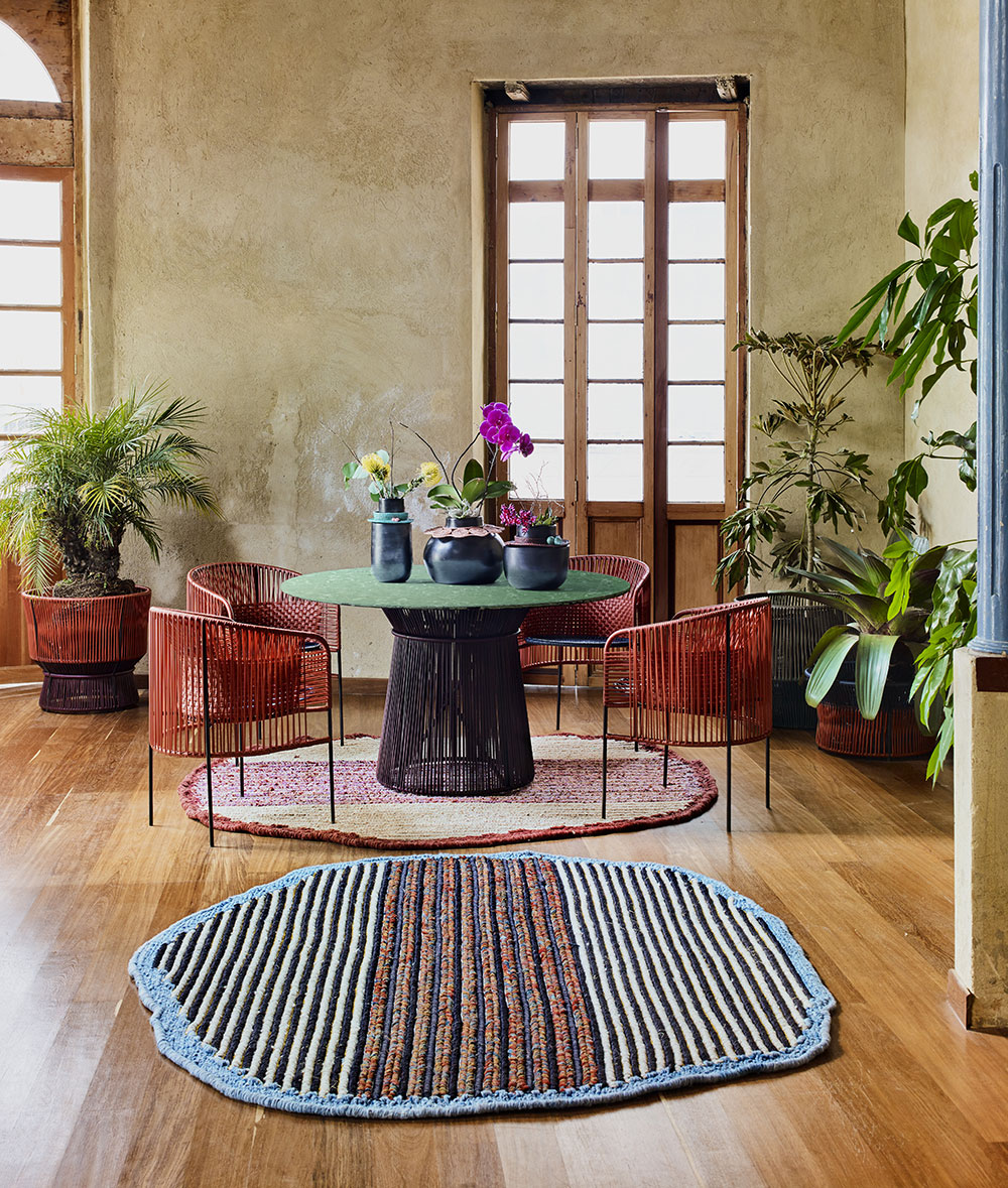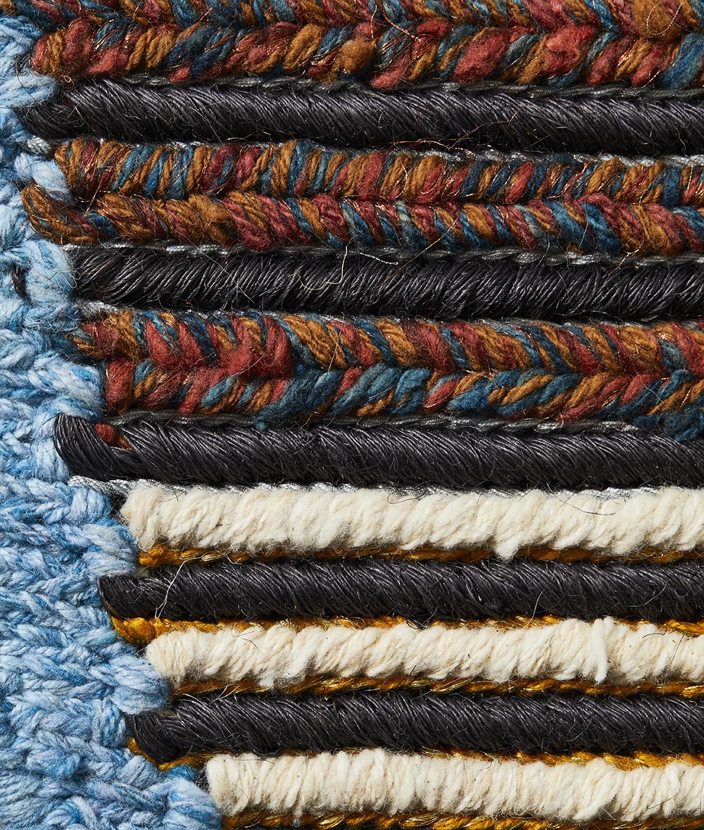 Designed by Mae Engelgeer, the Uilas collection takes inspiration from the landscape of the Colombian province of Huila. Referencing the interaction of two forces of nature: the river Rio Magdalena and the rough desert of Tatacoa in which the river flows through. In this collection, the use of natural sisal and the irregular edges of each rug represent the heavily eroded landscape found in the Tatacoa desert while the colourful wool stripes are reminiscent of the river running through the valley.