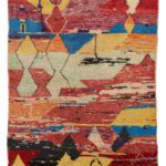 Hand-woven in the small town of Taznakht in the south of Morocco circa 1970. Carefully sourced, each vintage rug is a one-of-a-kind creation expressed through vibrantly rich colours and geometric motifs. Local Berber wool from family-owned farms and recycled yarn from clothing are often used in the weaving of these rugs, resulting in a high pile texture that is extremely soft and varied.