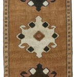 Kars rugs often feature geometric medallions, some of which are similar to caucasian designs, with shapes resembling butterflies, stars or crosses. They typically have a dominant palette of browns, with softer colours such as oranges and pinks, distinguishing them from other Anatolian rugs.