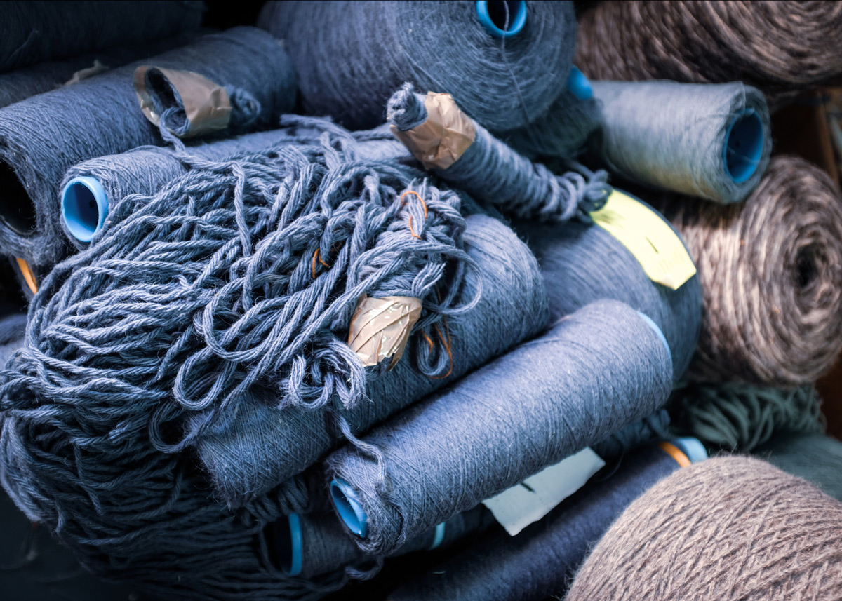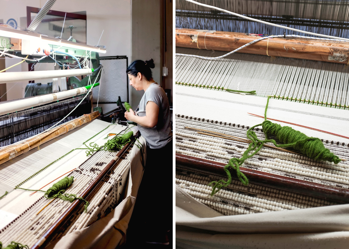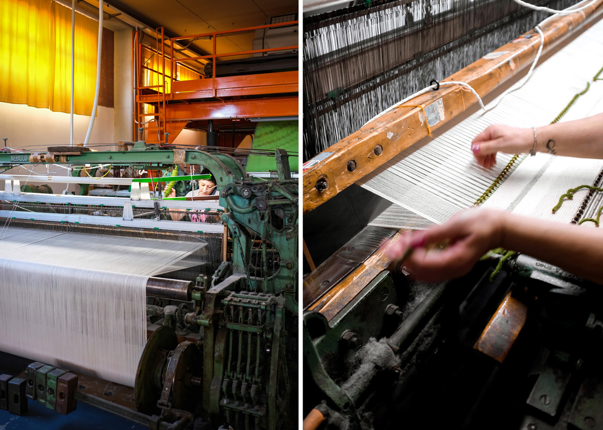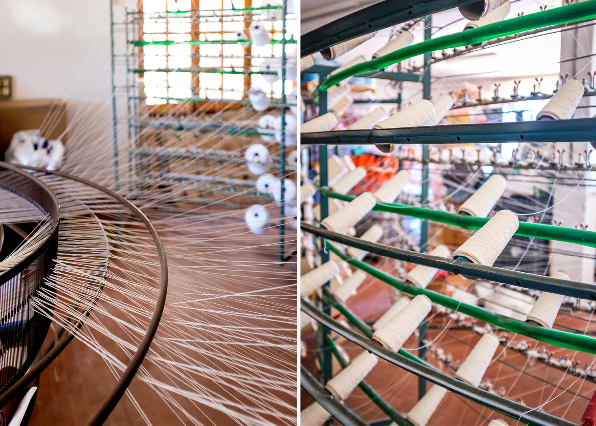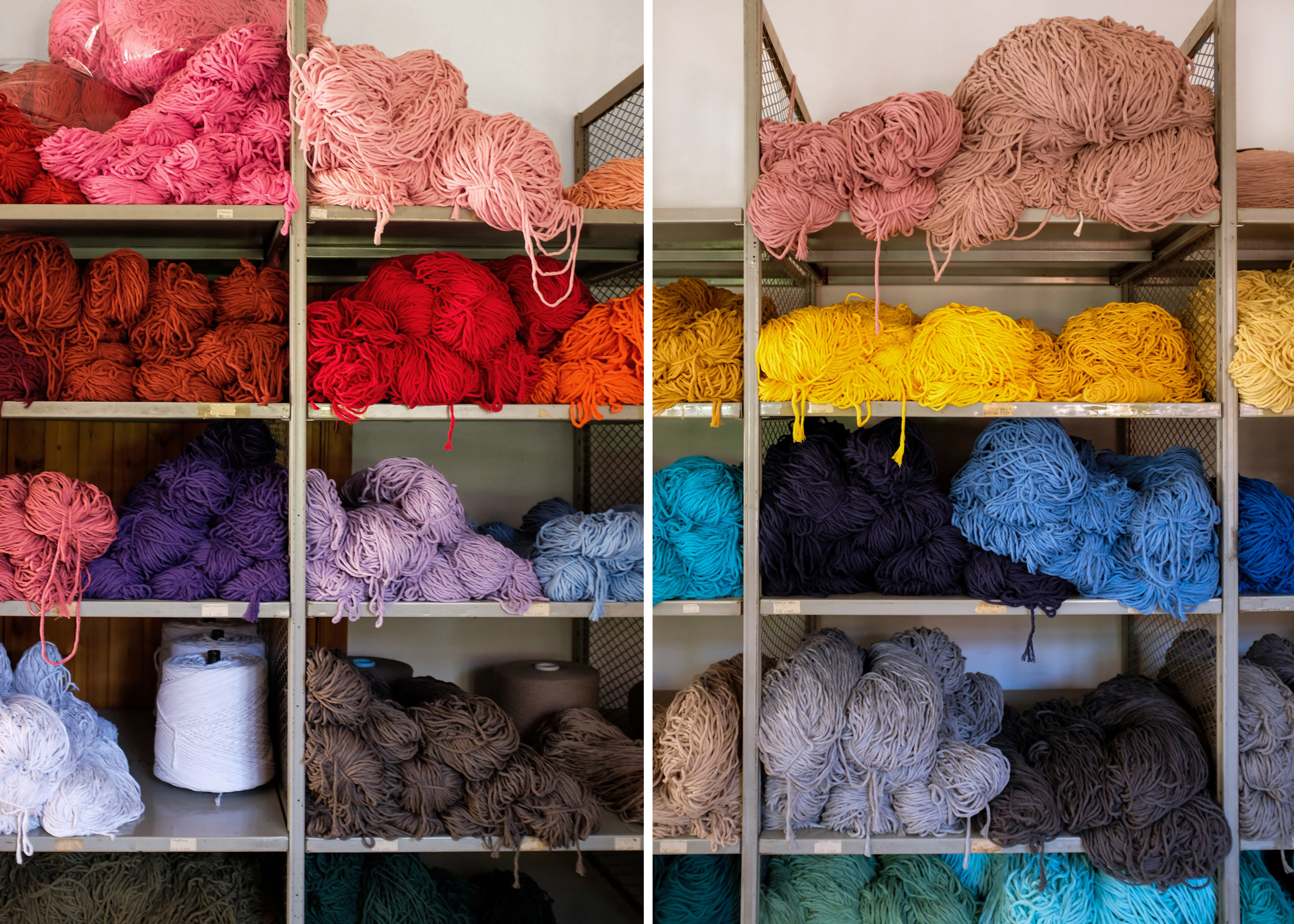 While the washing, carding and dyeing of the wool is carried out by entrusted local contractors, the spinning is done in-house so the workshop can experiment with combining different fibers and colours. It allows them to devise tailored solutions for specific projects and custom made pieces.