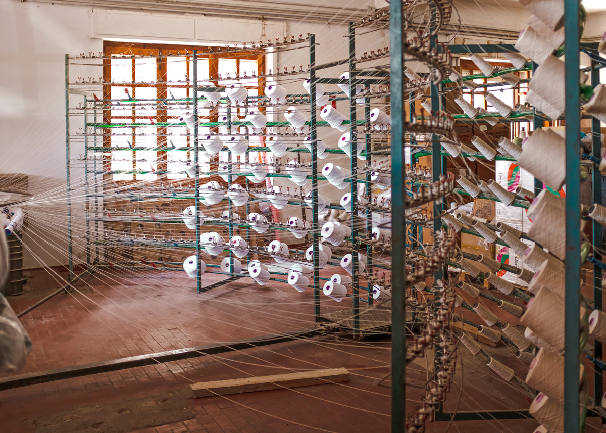 The size of the frame depends on the size of what is being woven, and for a company like Mariantonia Urru which produces large rugs and fabrics, an entire room is required to accommodate the warping frame.