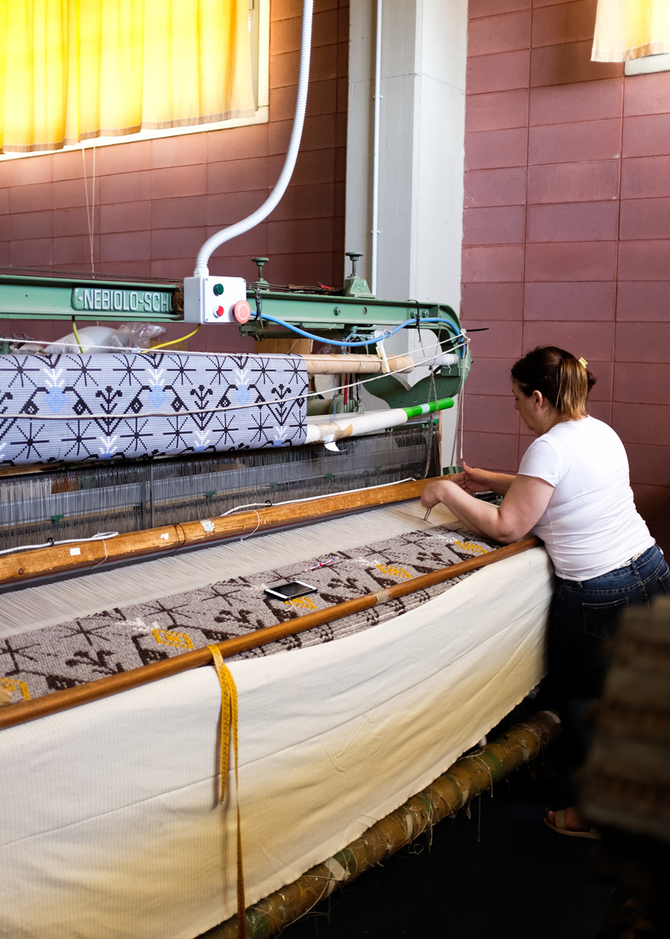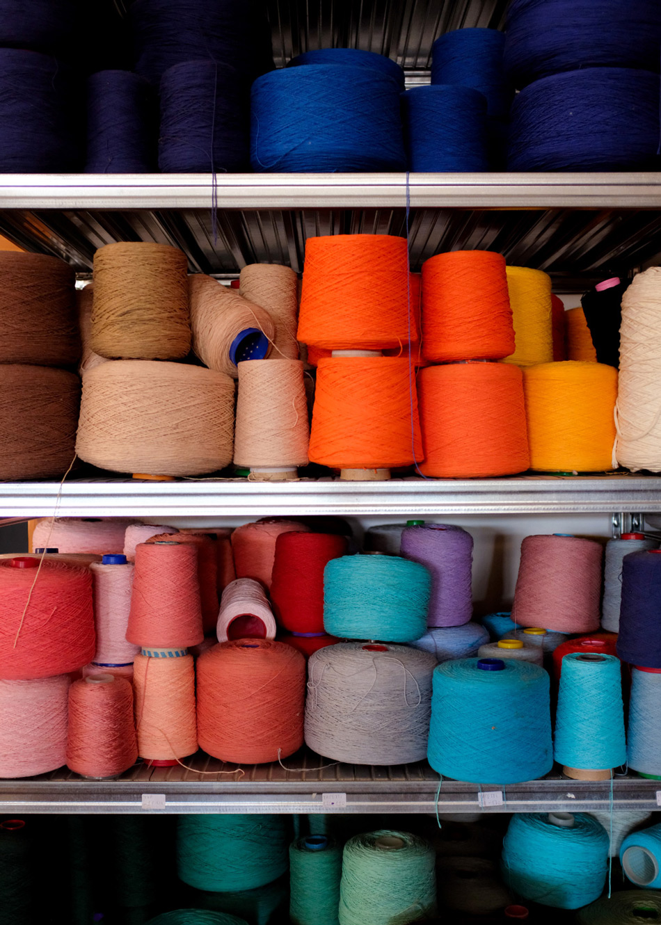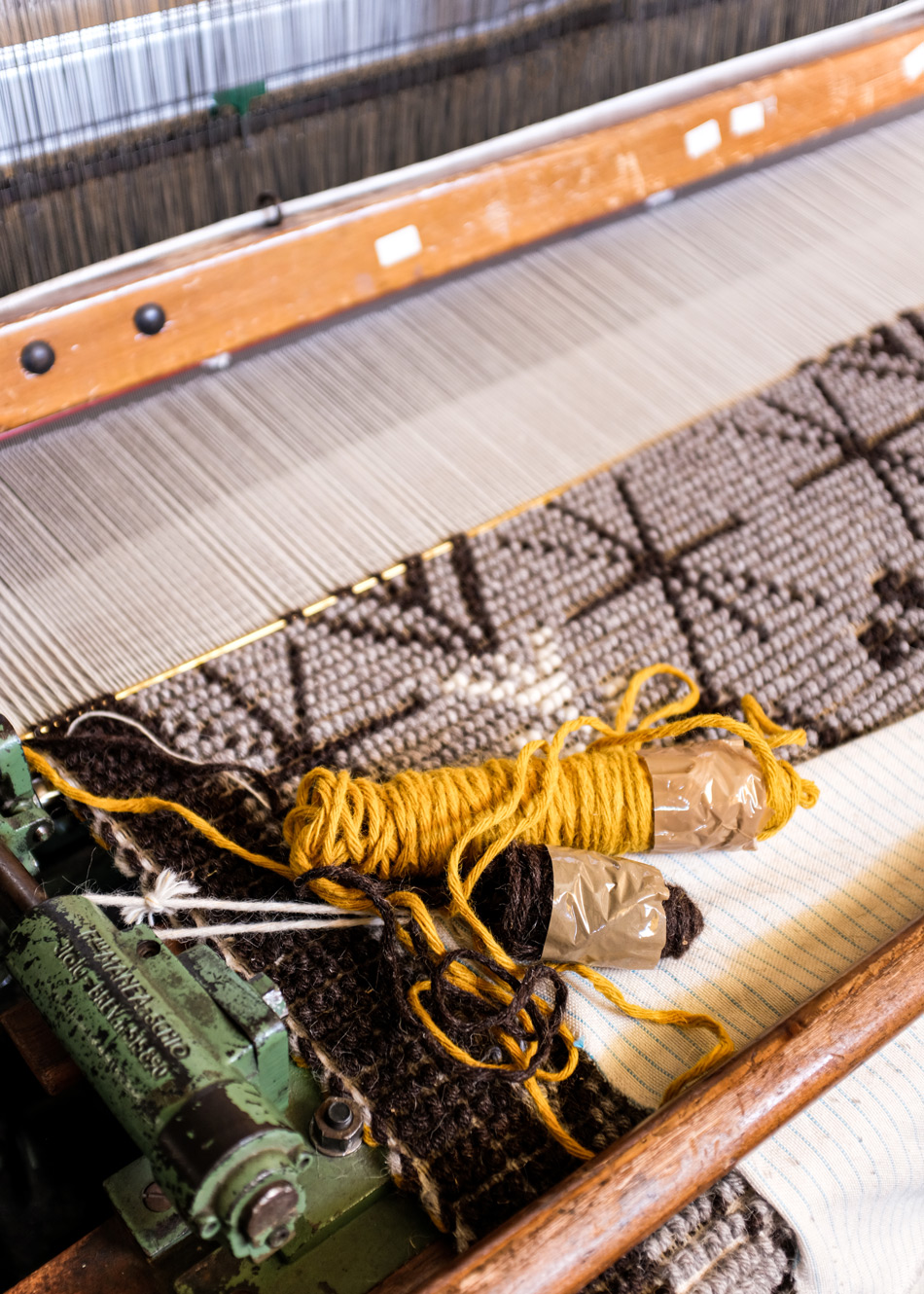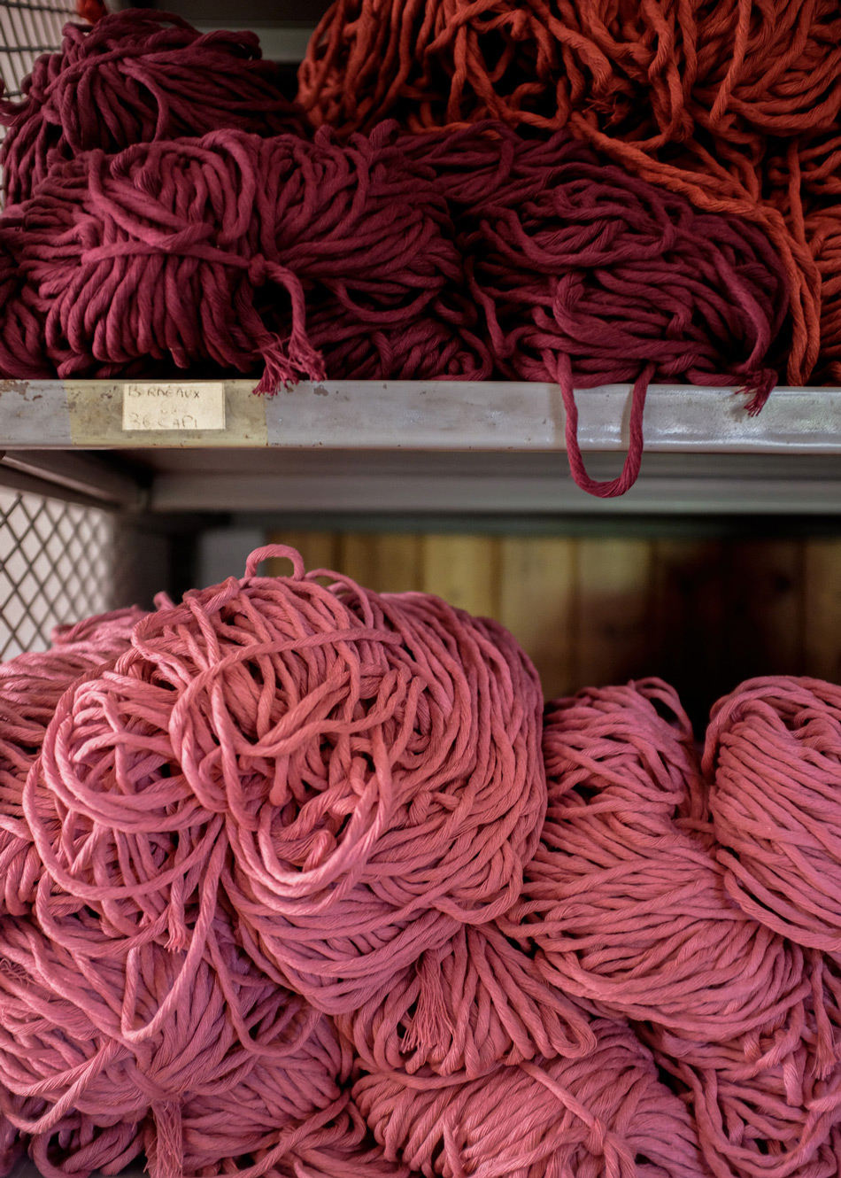 While the washing, carding and dyeing of the wool is carried out by entrusted local contractors, the spinning is done in-house so the workshop can experiment with combining different fibers and colours. It allows them to devise tailored solutions for specific projects and custom made pieces.