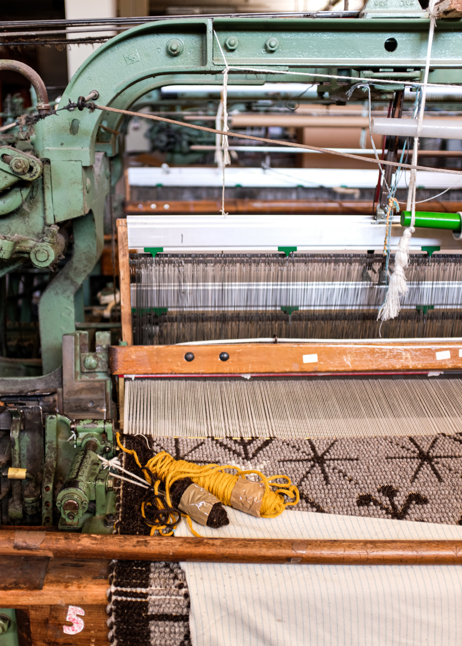 The workshop has approximately 25 weaving frames of varying sizes and purposes and most of the rugs are still woven on impressive, antique-like mechanical looms. These looms have been slightly altered to accommodate an automatic shuttle and beater bar that alleviates some of the physical manoeuvres of weaving.