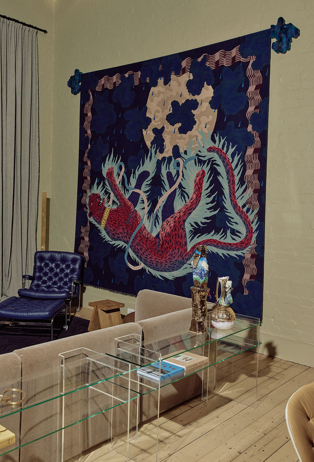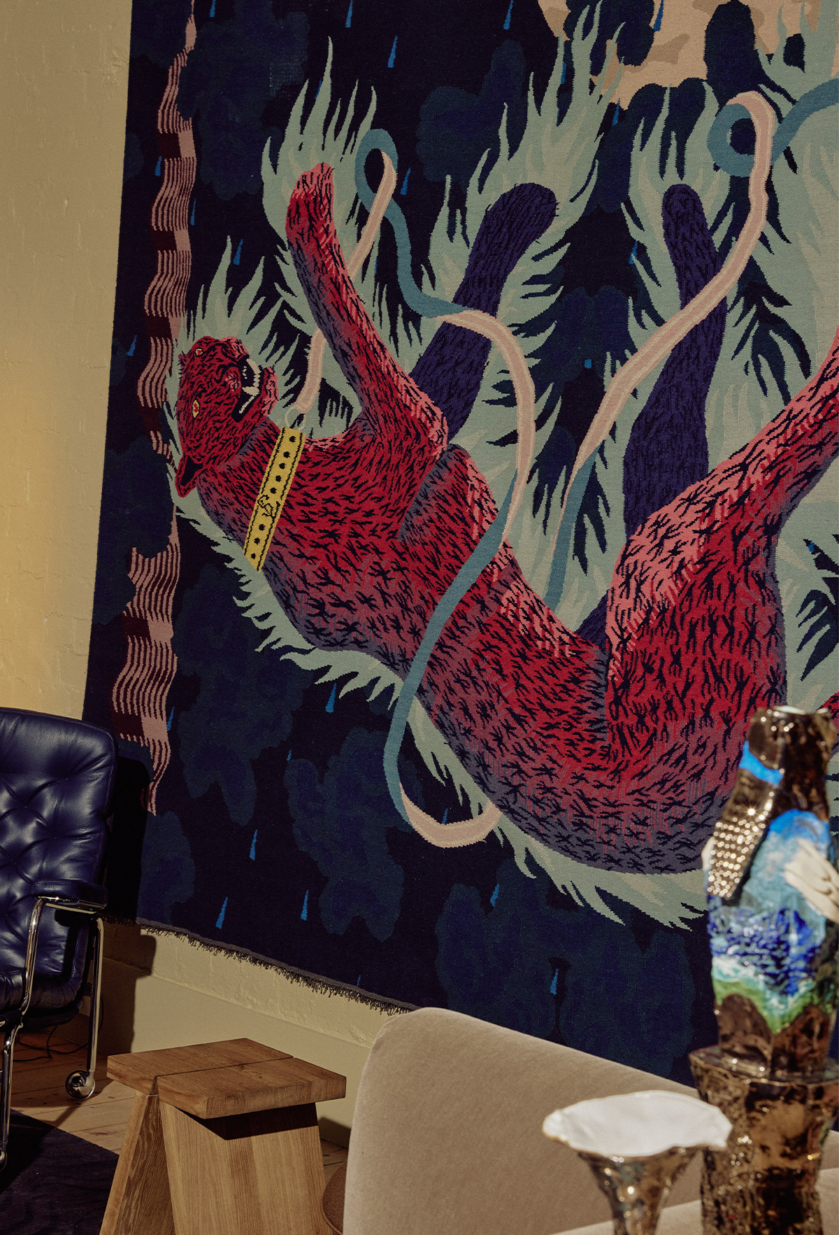 Berlin Designer Reuber Henning took centre stage with their numerous handmade designs showcased throughout the exhibition. This included a tapestry, floor rugs, and a unique hanging hammock rug. Inspired by the poignant narrative of Count Ladislaus von Fraunberg, a nobleman who faced the tragic loss of both his wives and passed away without leaving any heirs, the tapestry eloquently portrays the unwavering loyalty of a leopard, a cherished gift from his brother-in-law.