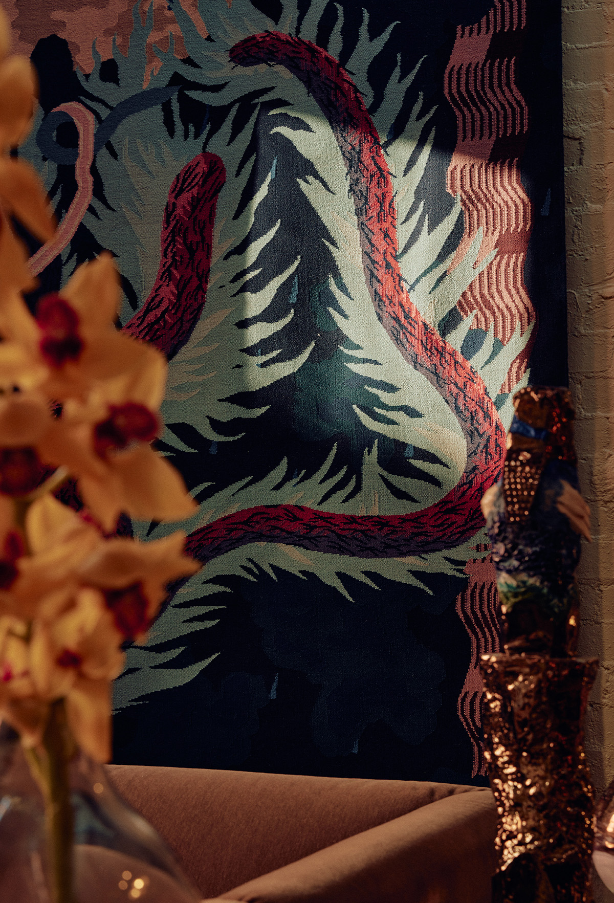 Blending Chinese silk and Tibetan highland wool, the collection conceptualises rhythm and a sweeping melody, paying homage to the early jazz era. The distinctive aesthetic and unconventional colour combinations pair the room to create a vibrant yet calming atmosphere.