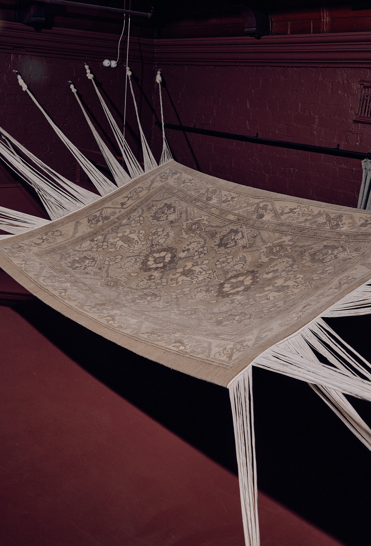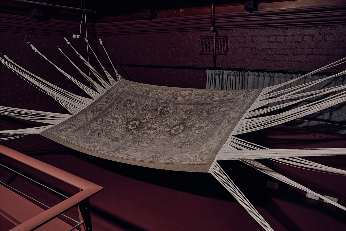 With a deliberate intention to emphasize the essence of a handwoven carpet, Reuber Henning and Bless extended the fringes of the rug, highlighting the intricately knotted nature of the piece. By stripping away the original colours, the carpet takes on a silver hue, resulting in an ethereal and shimmering appearance as it gracefully suspends in mid-air.