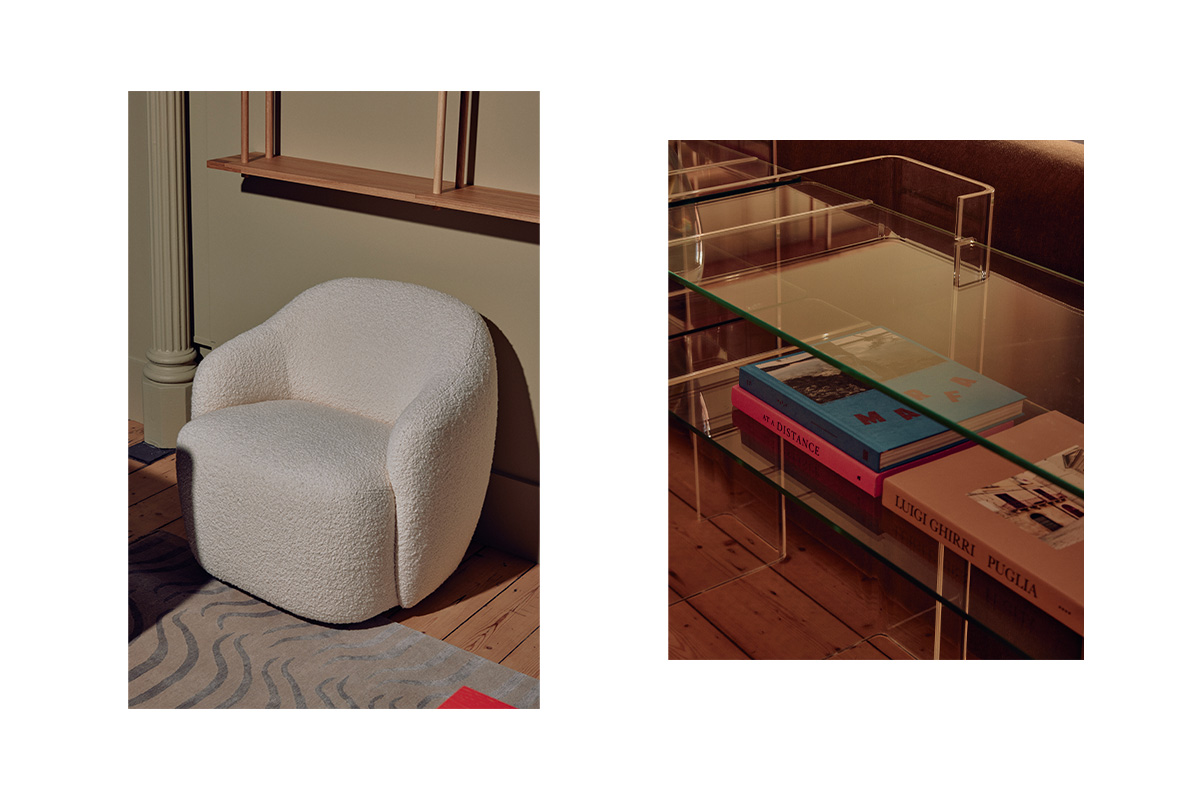 The Reuber Henning Kenia Acacia rug embellished the mezzanine floor, with shimmering gold details made from Tibetan wool and silk. Part of the “Made by Nature” collection, the design draws inspiration from the patterns found in animal furs, which have been simplified, modified, and reinterpreted with a graphic touch.