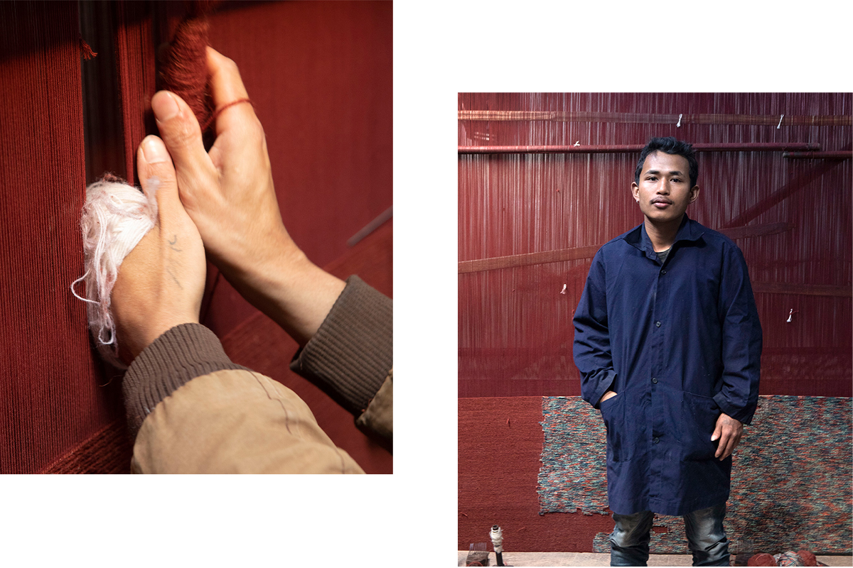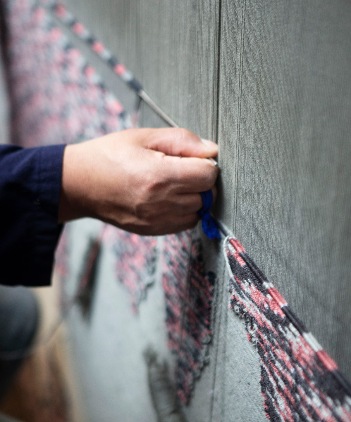 These ‘disruptive’ yarns became a delicate repeating zigzag ‘pattern’ throughout the rug, mapping the original shape of the rug fragments that originally inspired each design. Certain patterns are dense and intricate, while others comprise larger areas of single colours that vary in shape. The sole element that aligns with the original fragments is the colours with which the yarns were dyed.
