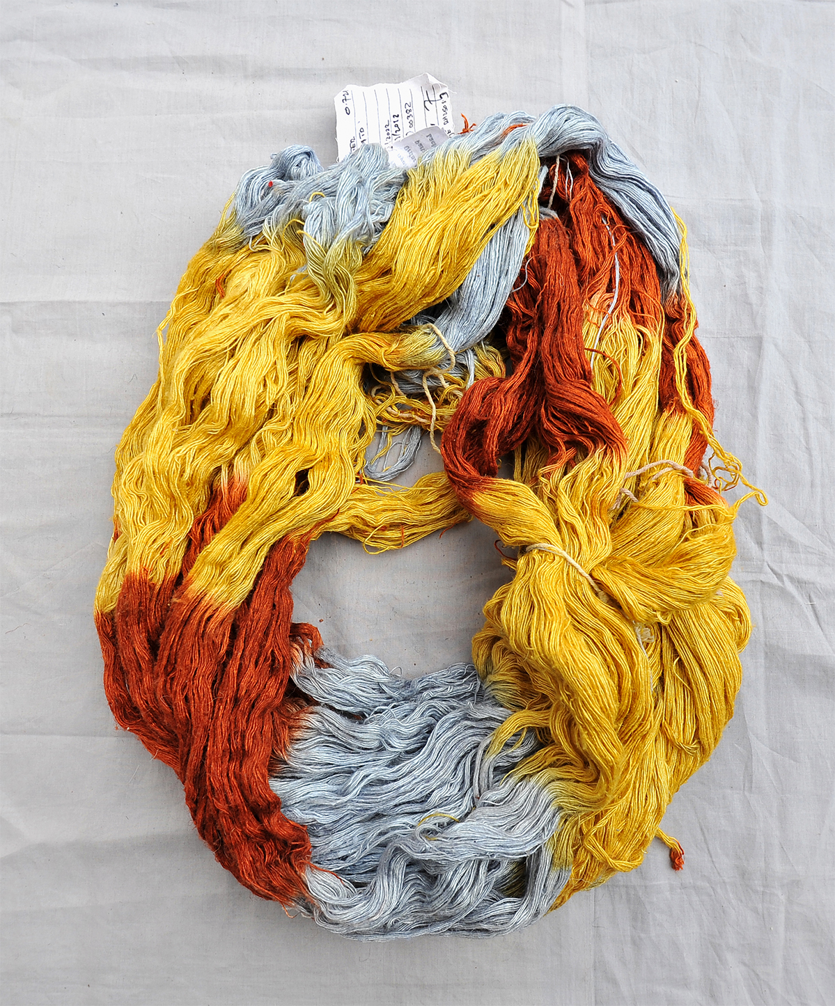 By replacing the original fragmented shapes with pure silk Tie Dye yarn, new patterns and colours were able to emerge. “Chance is often a welcome partner in our designs”, says Birgit, whereby the unpredictability of the tie dyed yarn was able to create new patterns unimaginable before.