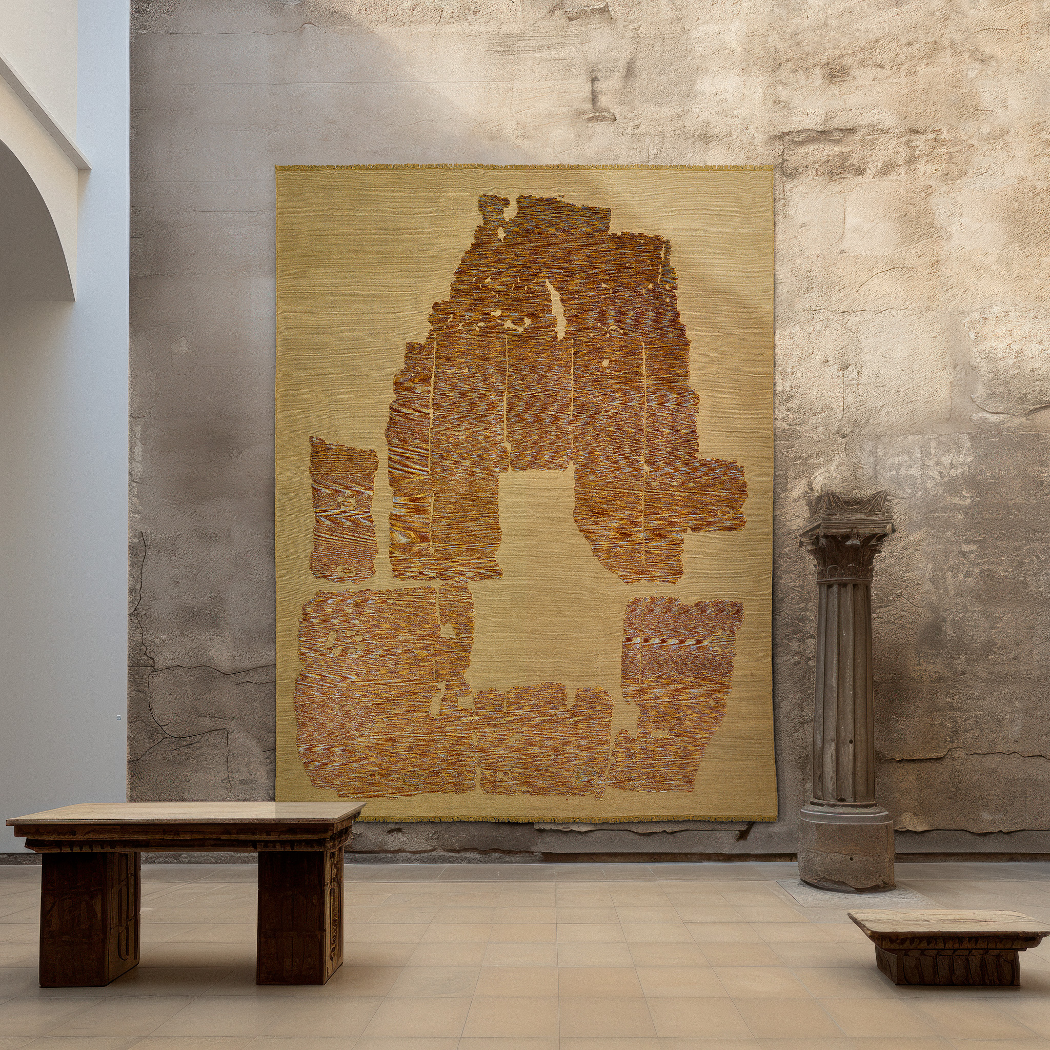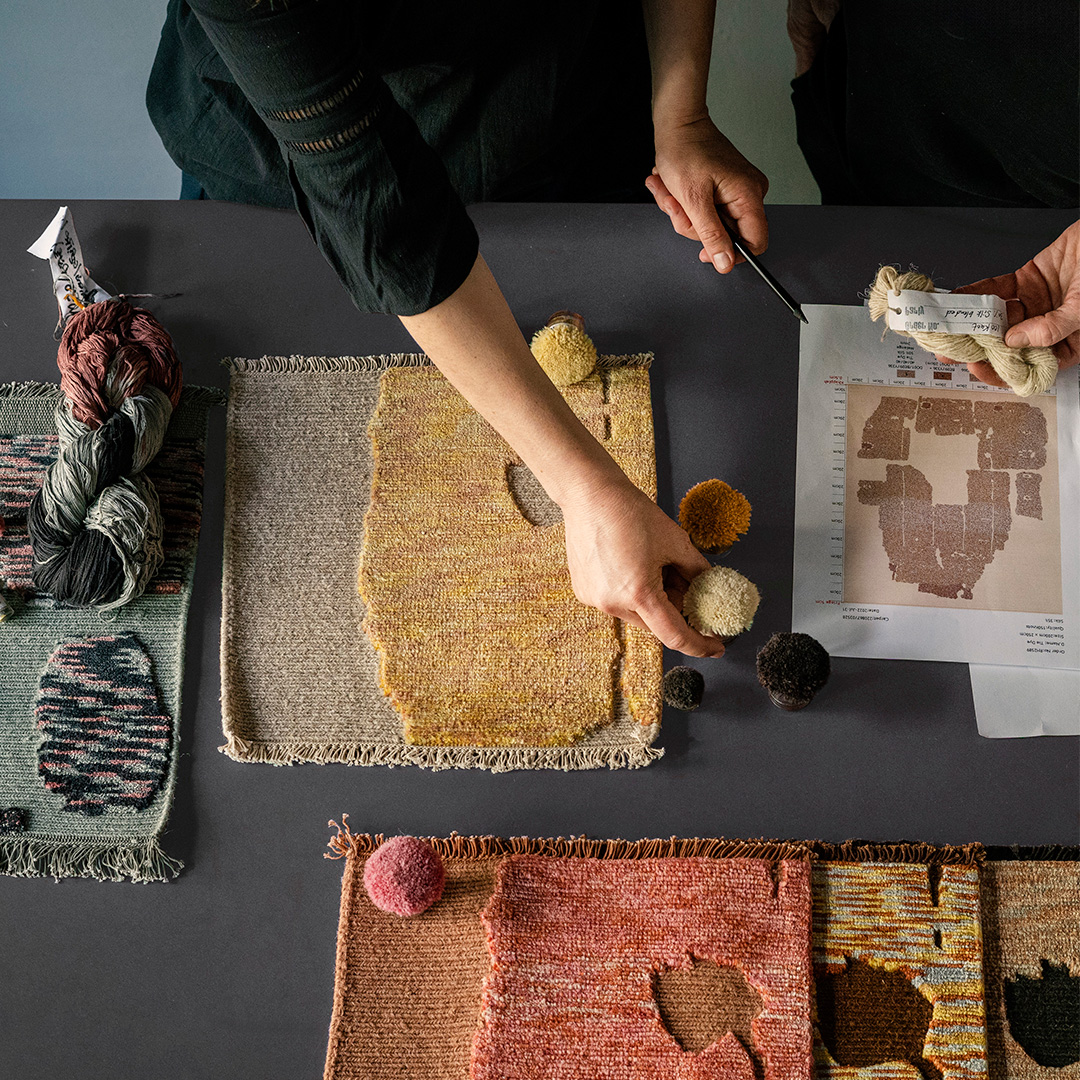 Exploring the fragments of these ancient rugs provided a roadmap for the Tie-Dye collection. Each fragmented piece exhibits its own distinct shape and contours, enabling Reuber Henning to derive the patterns for their new collection from these outlines.